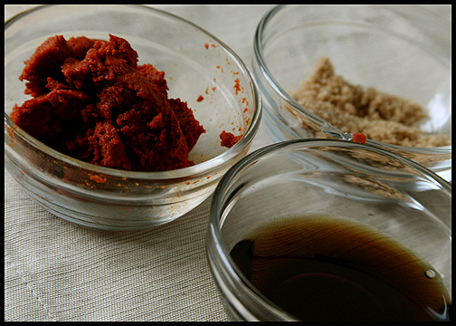 Raichlen suggests cutting the pork into thin strips. This is a hard task to do. First, I had freezing the pork for 30 minutes to make slicing easier but that didn't turn out so well. This time I just decided to cut half inch steaks to ensure even grilling on the pork. Cover the pork in the marinade and set in fridge for 4-6 hours or overnight.