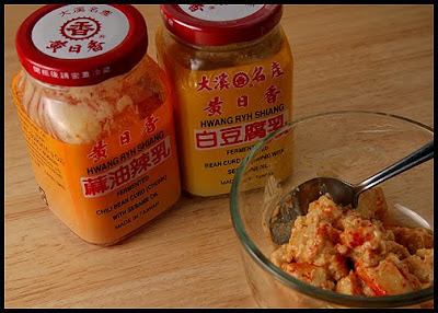 Originally from China, tofu is an excellent source of protein, iron and calcium. The pickled bean curd are cubes of tofu that have been fermented in rice wine combined with sesame oil, salt, vinegar. The version I used was enhanced with chiles to give it a spicy flavor.